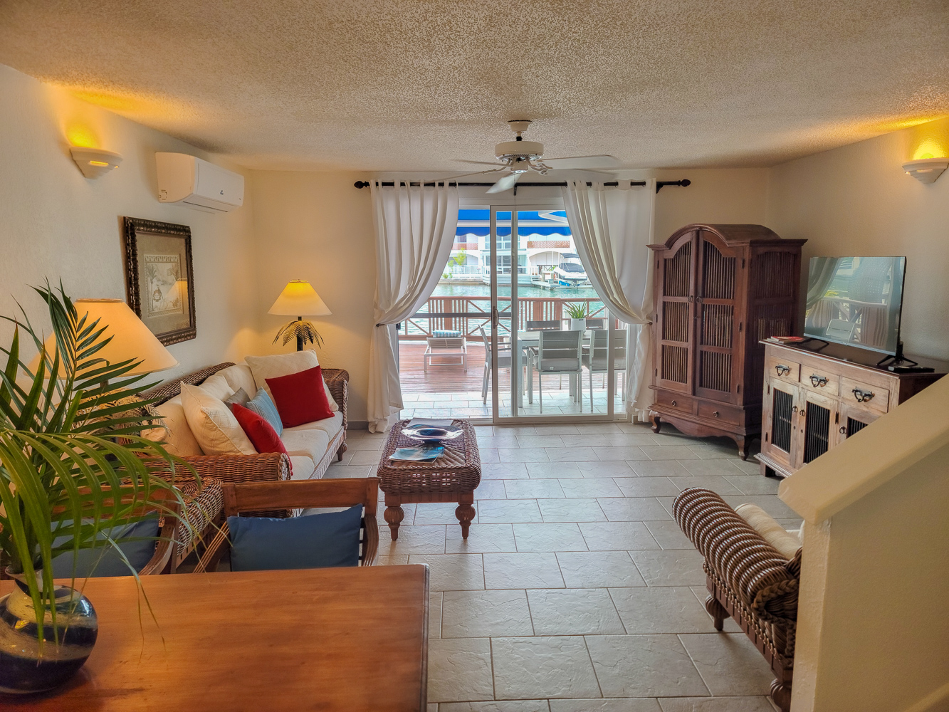 Large sliding glass doors fill the villa with natural light and lead directly to a private waterfront patio—perfect for morning coffee, evening cocktails, or simply soaking in the marina views.