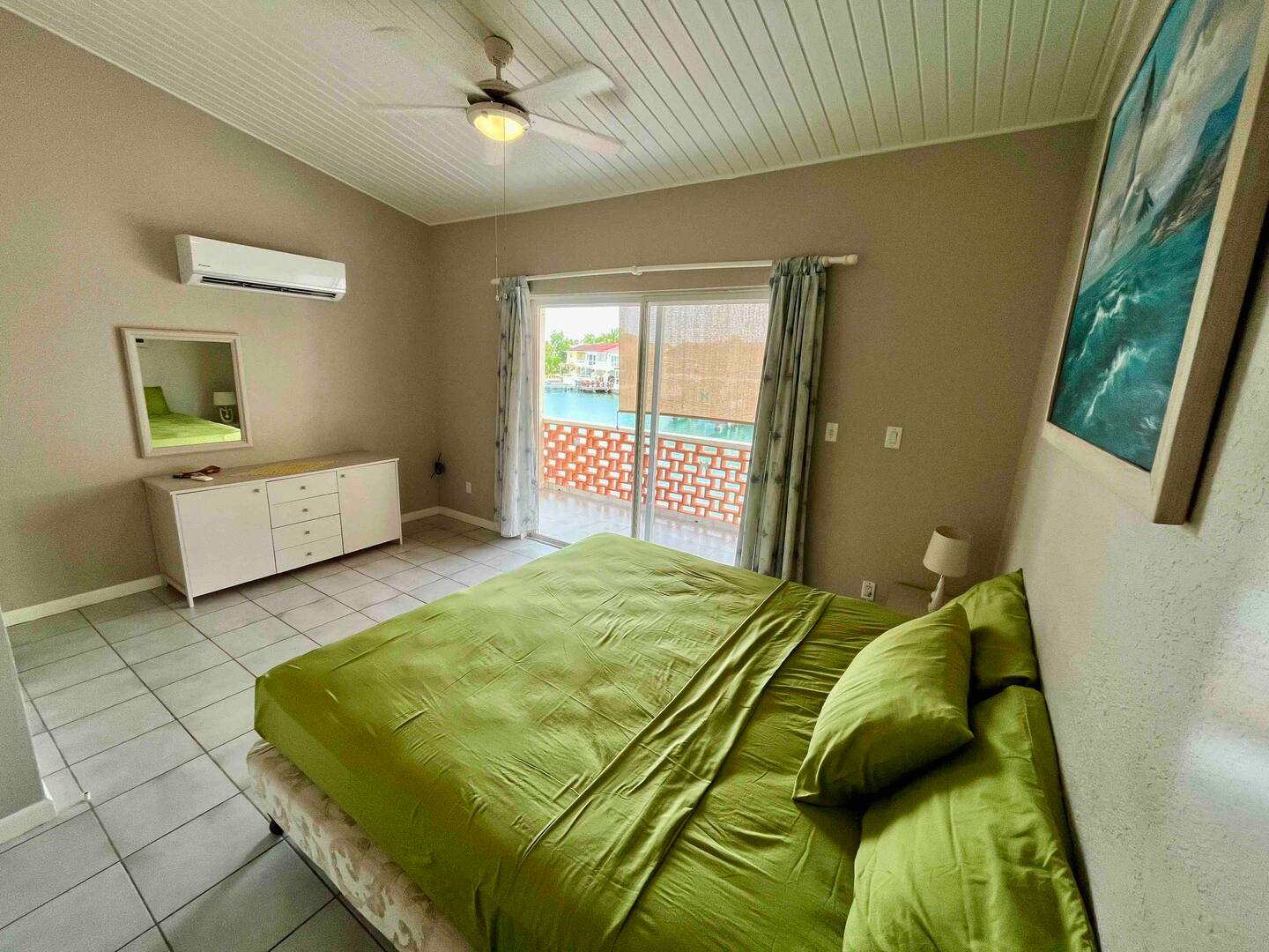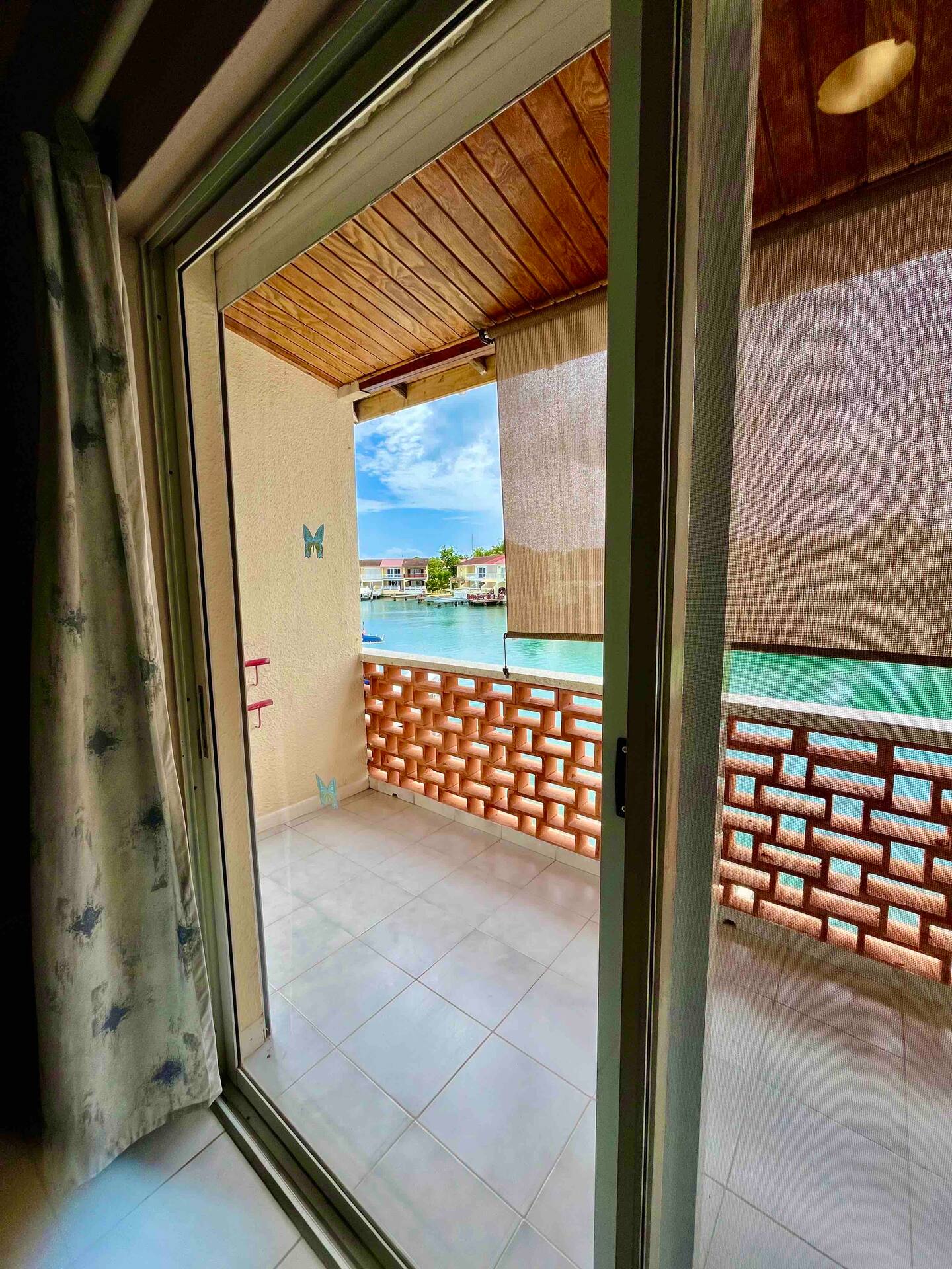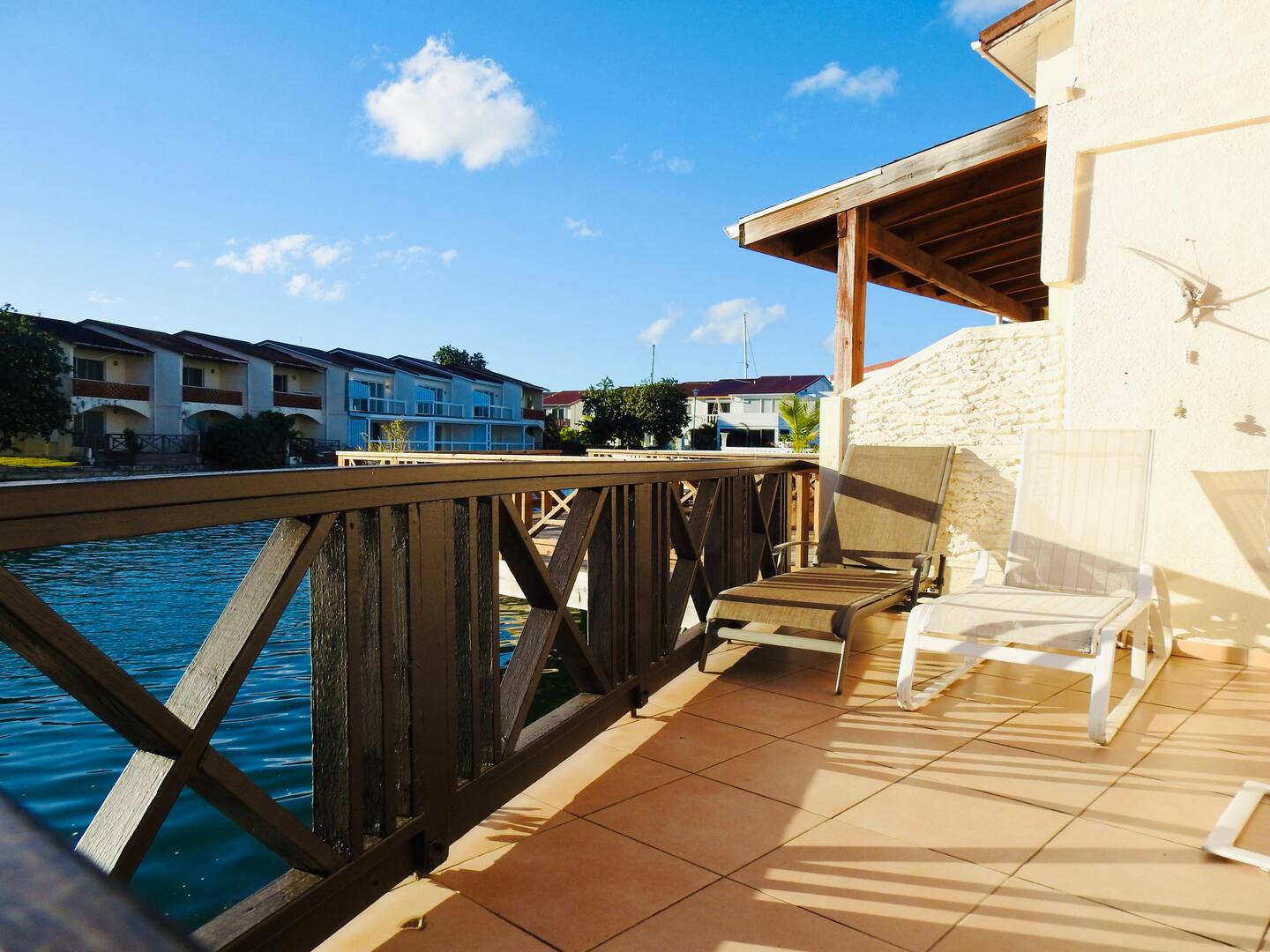 Inside, the villa offers a bright open-plan living area, a fully equipped kitchen, air conditioning, and a covered terrace overlooking the water—perfect for dining outdoors or relaxing with sunset views. Upstairs, the master suite features a king bed and private balcony, while the second bedroom includes twin beds and its own balcony, making it perfect for groups or families.