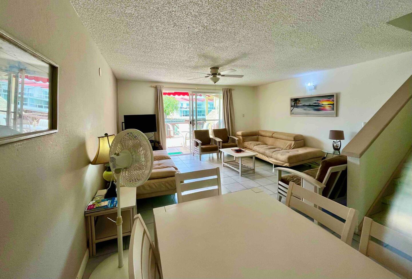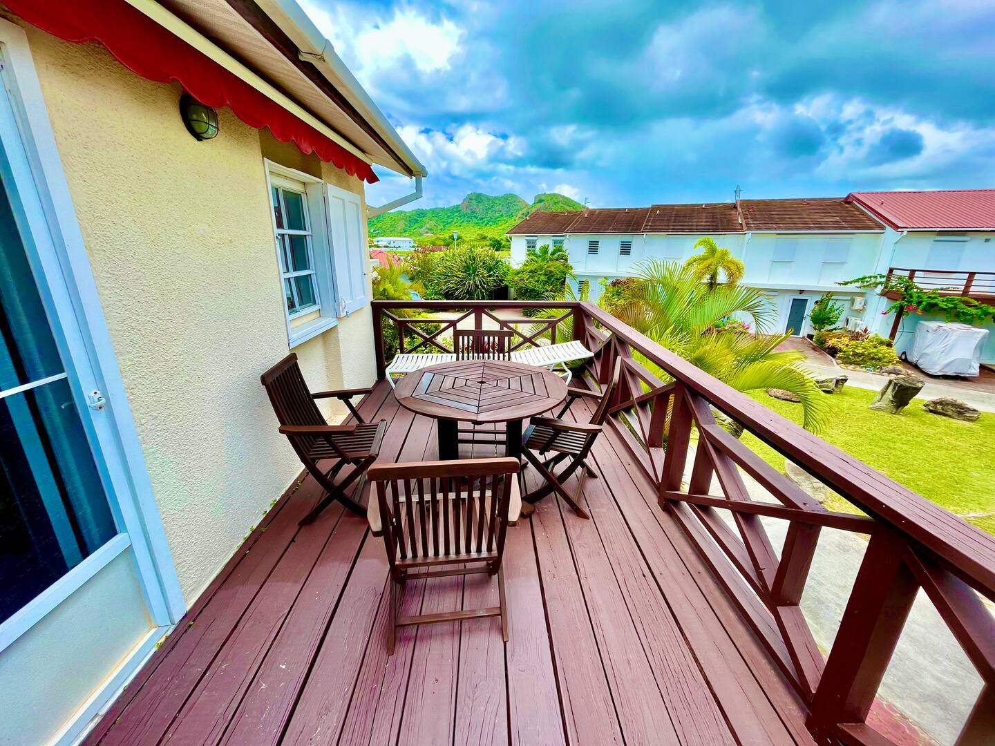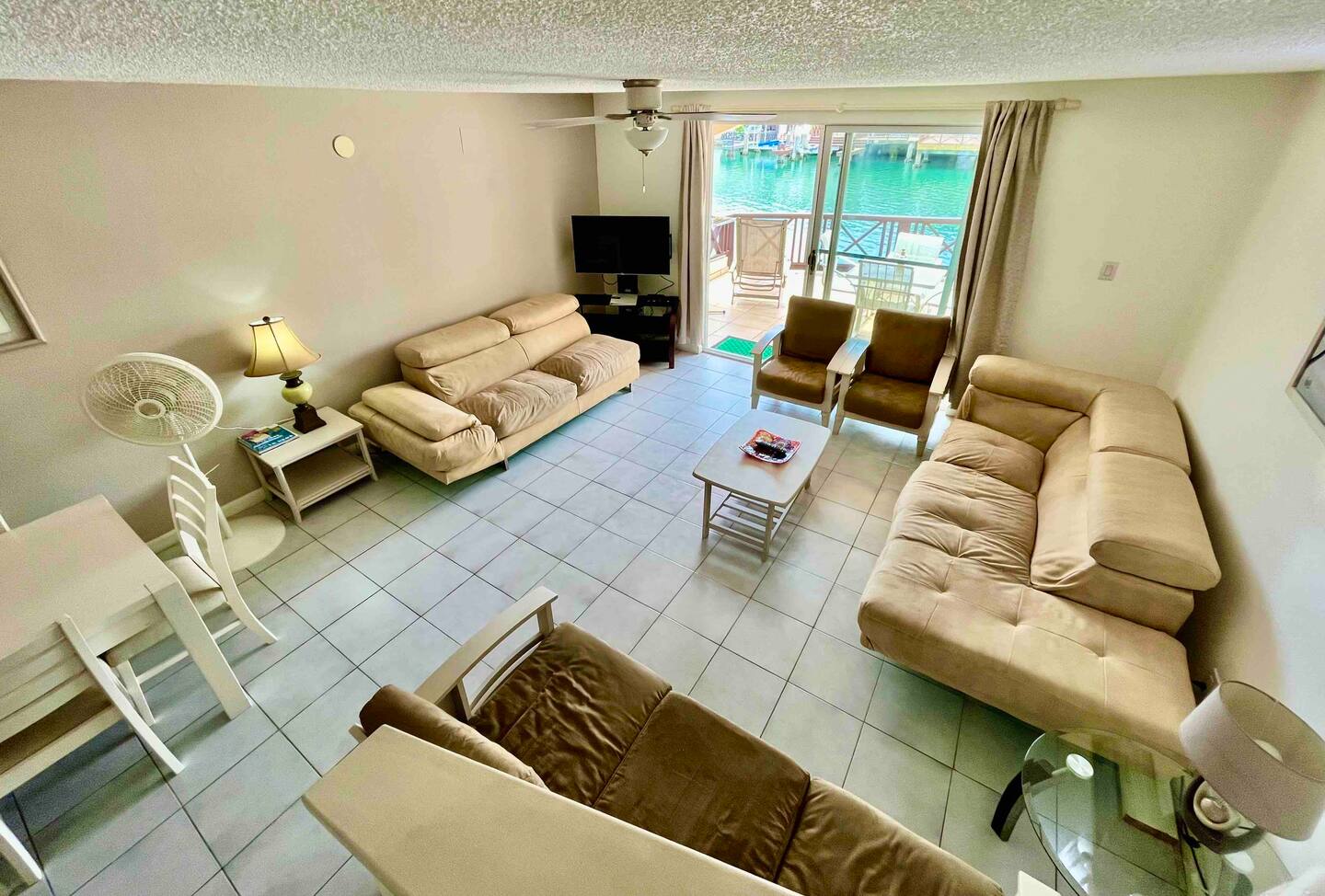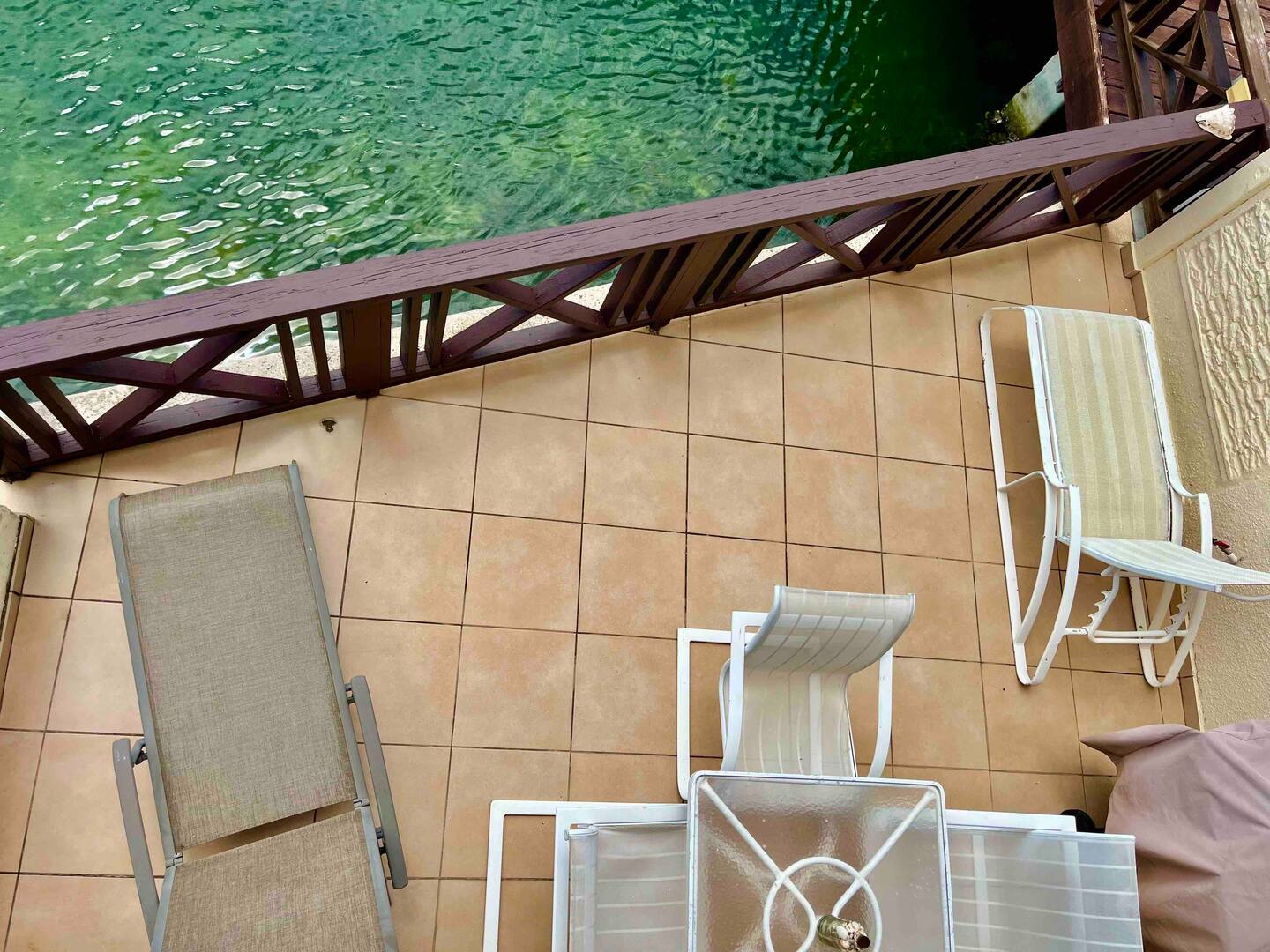 Inside, the villa offers a bright open-plan living area, a fully equipped kitchen, air conditioning, and a covered terrace overlooking the water—perfect for dining outdoors or relaxing with sunset views. Upstairs, the master suite features a king bed and private balcony, while the second bedroom includes twin beds and its own balcony, making it perfect for groups or families.